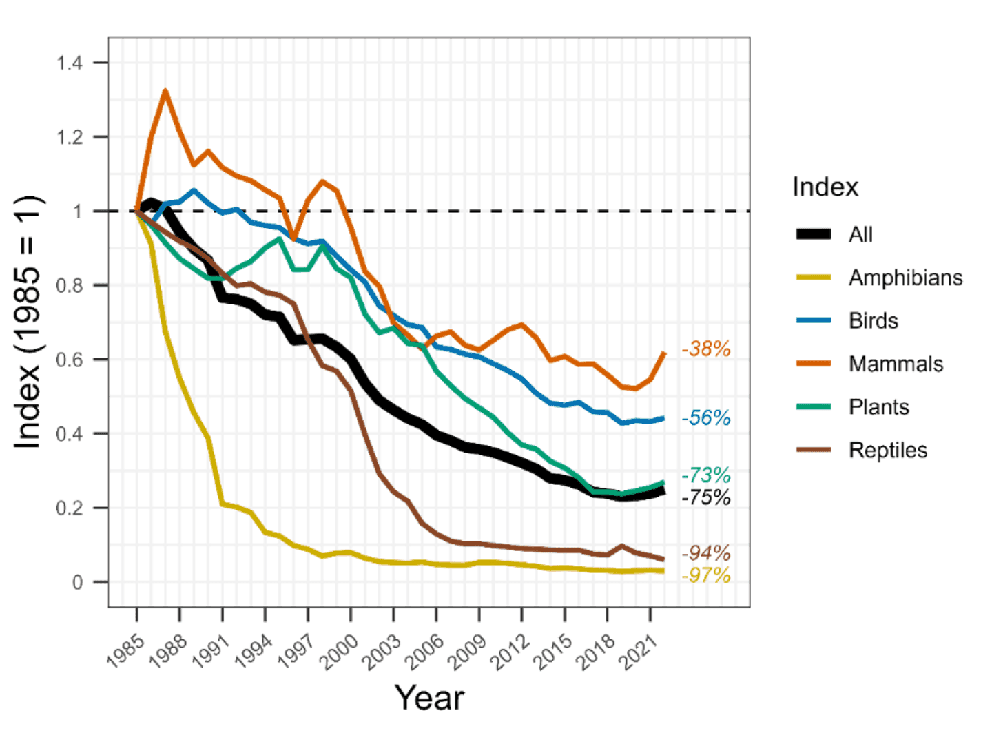 The population size trends for the different species groups in the Threatened Species Index, showing all groups have suffered large declines, with frogs and reptiles experiencing the most. The black line is the average.