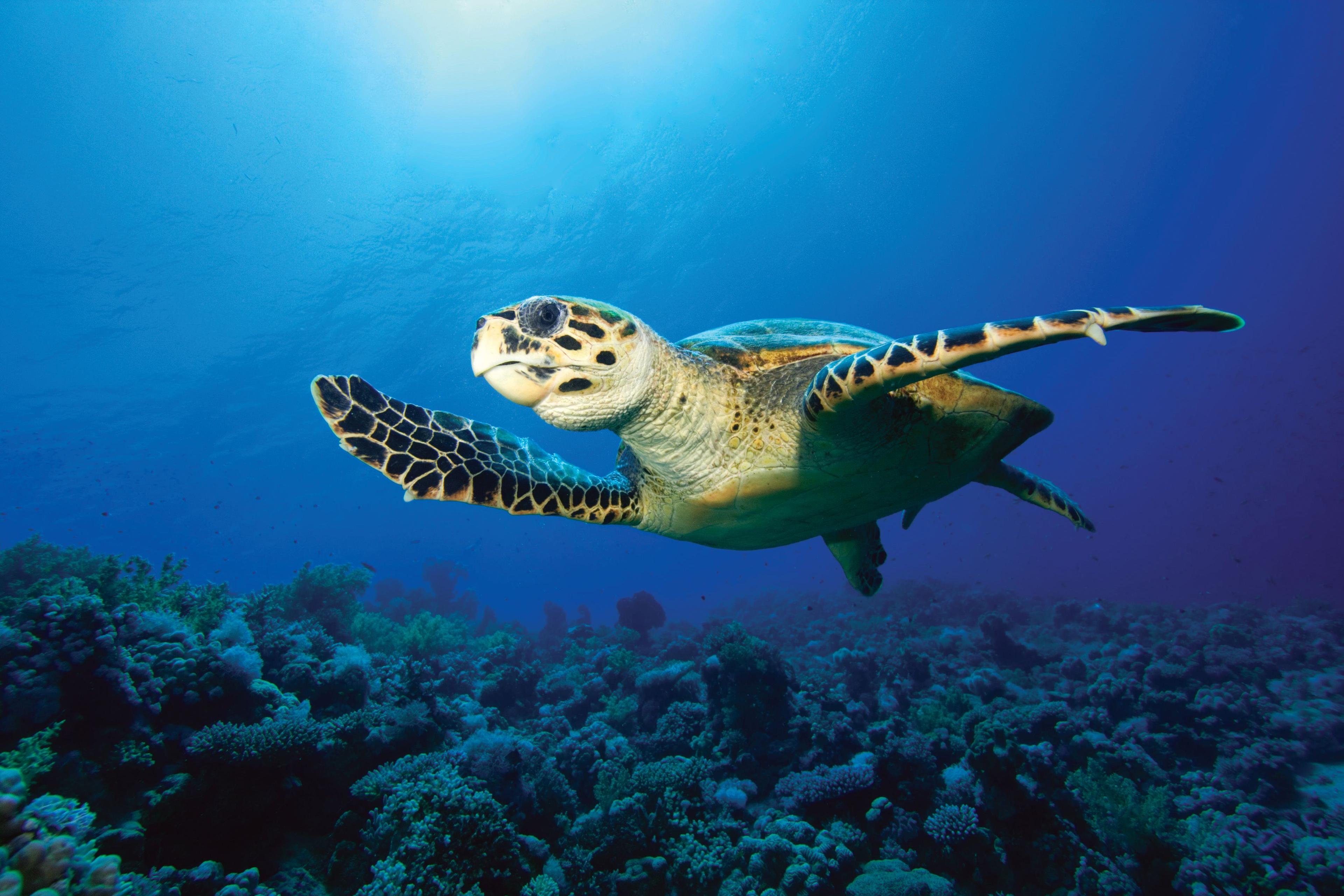 The hawkesbill sea turtle (Eretmochelys imbricata) is a Critically Endangered reptile on the IUCN Red List. Image: richcarey / iStock