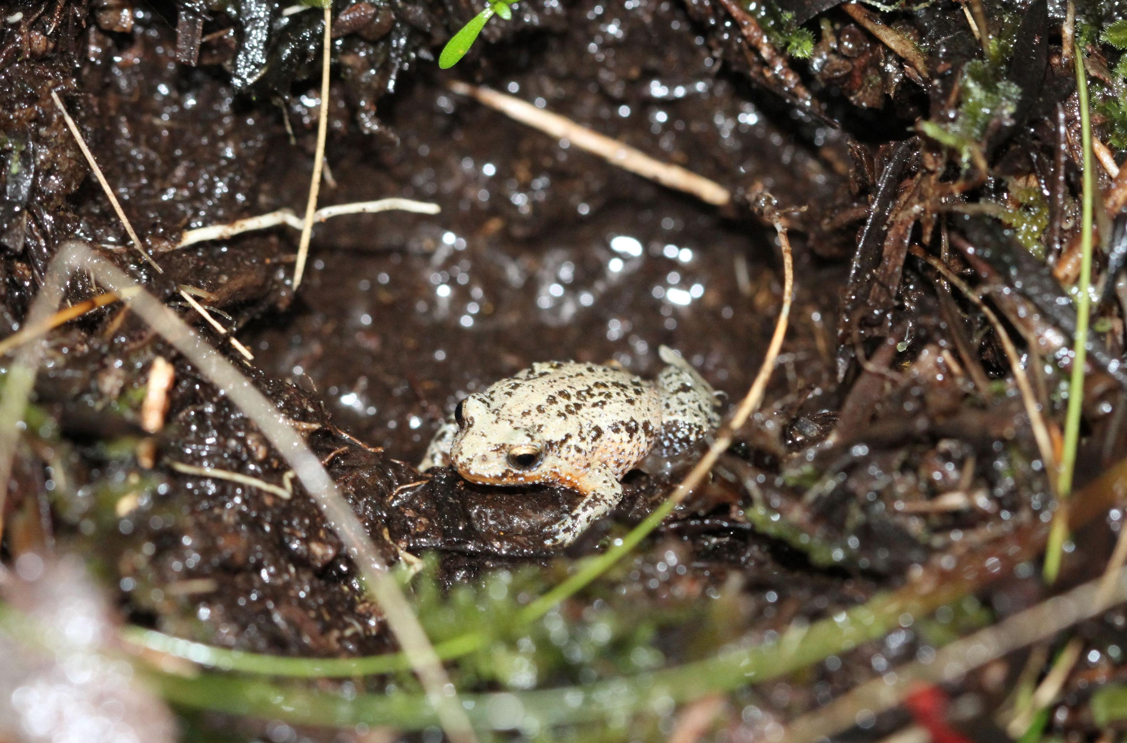 The critically endangered white-bellied frog is one of many terrestrial breeding frogs that is put at risk if its habitat dries out. It lays its eggs in shallow nests in the soil under dense vegetation. Tadpoles never leave their nest and take two to three months to metamorphose. Image: Emily Hoffmann.