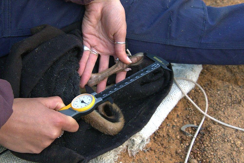 A researcher measures a woylie foot. Woylies protected from predators lost traits they need to escape predators. Image: Aiden Holmes