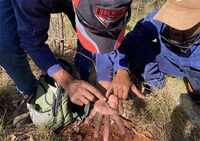 Yawuru Country managers investigating the impacts of fire-mosaic attributes on the occurrence of the greater bilby (Ngarlgumirdi) on the Dampier Peninsula. Source: Harry Moore.