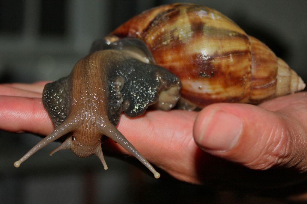 The introduced giant african snail. Image: Thomas Brown, CC BY 2.0 DEED via Wikimedia Commons