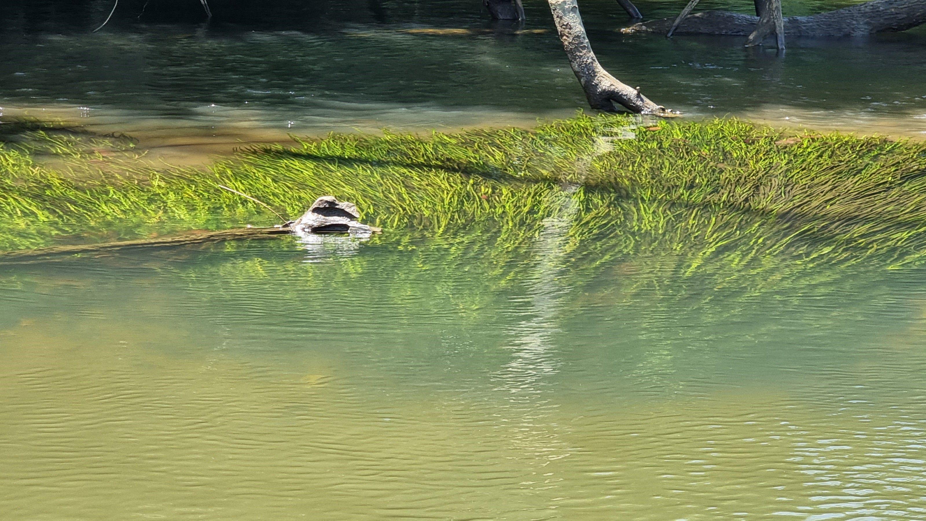 An aerial view of Vallisneria nana macrophyte beds that naturally recruited in the Russell River following control of the introduced species Glush Weed (Hygrophila costata). Image: Susannah Leahy, Department of Agriculture and Fisheries 2024.