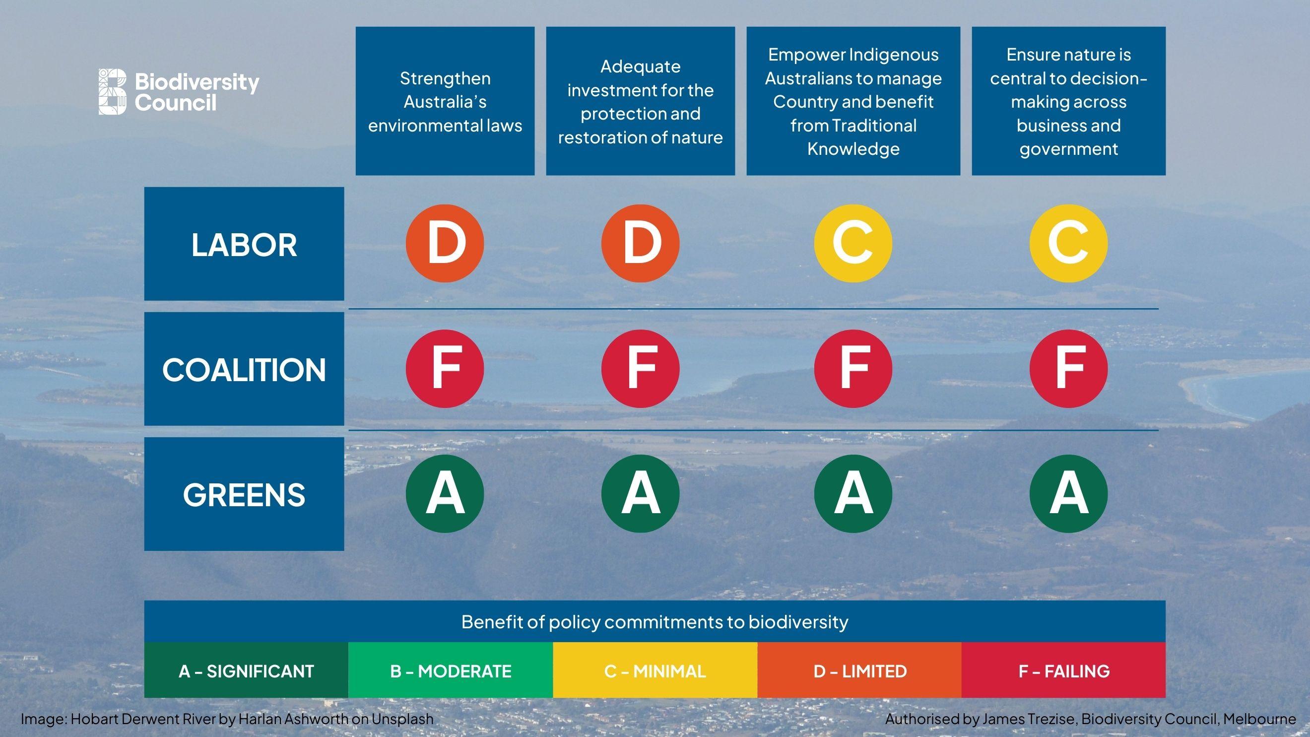 The assessment evaluated the policy commitments of Labor, the Coalition, and the Australian Greens against four key areas necessary for effectively managing nature: