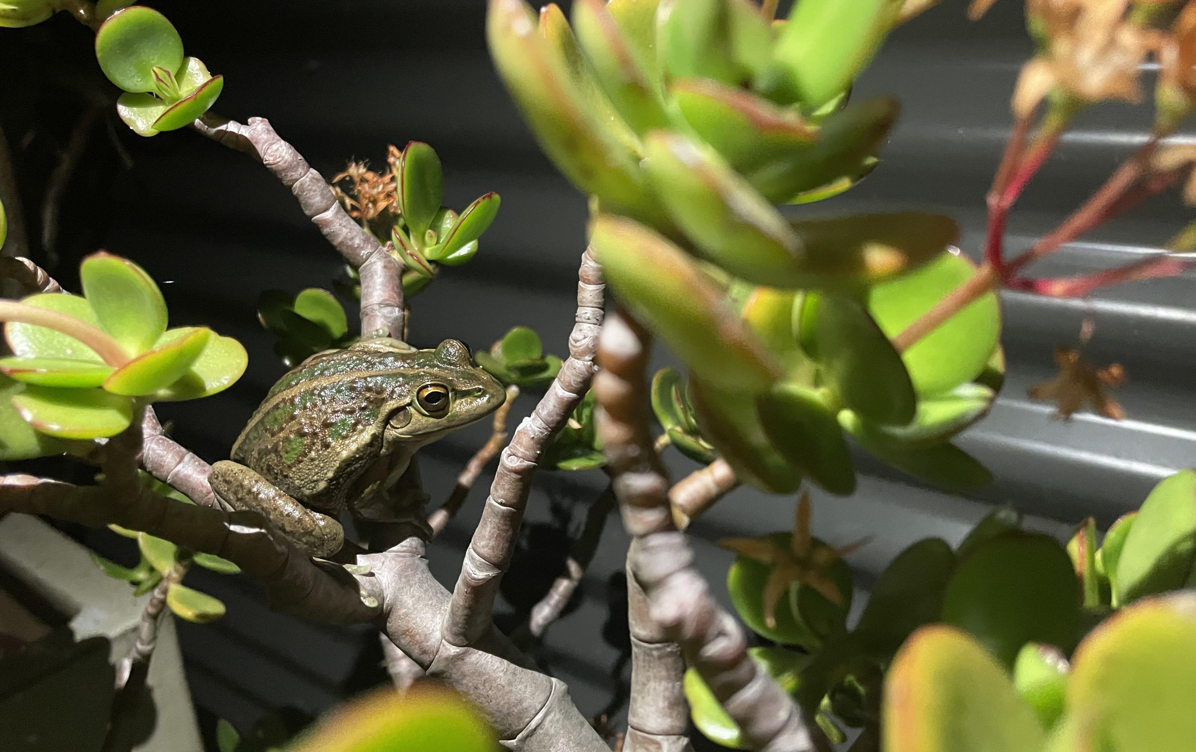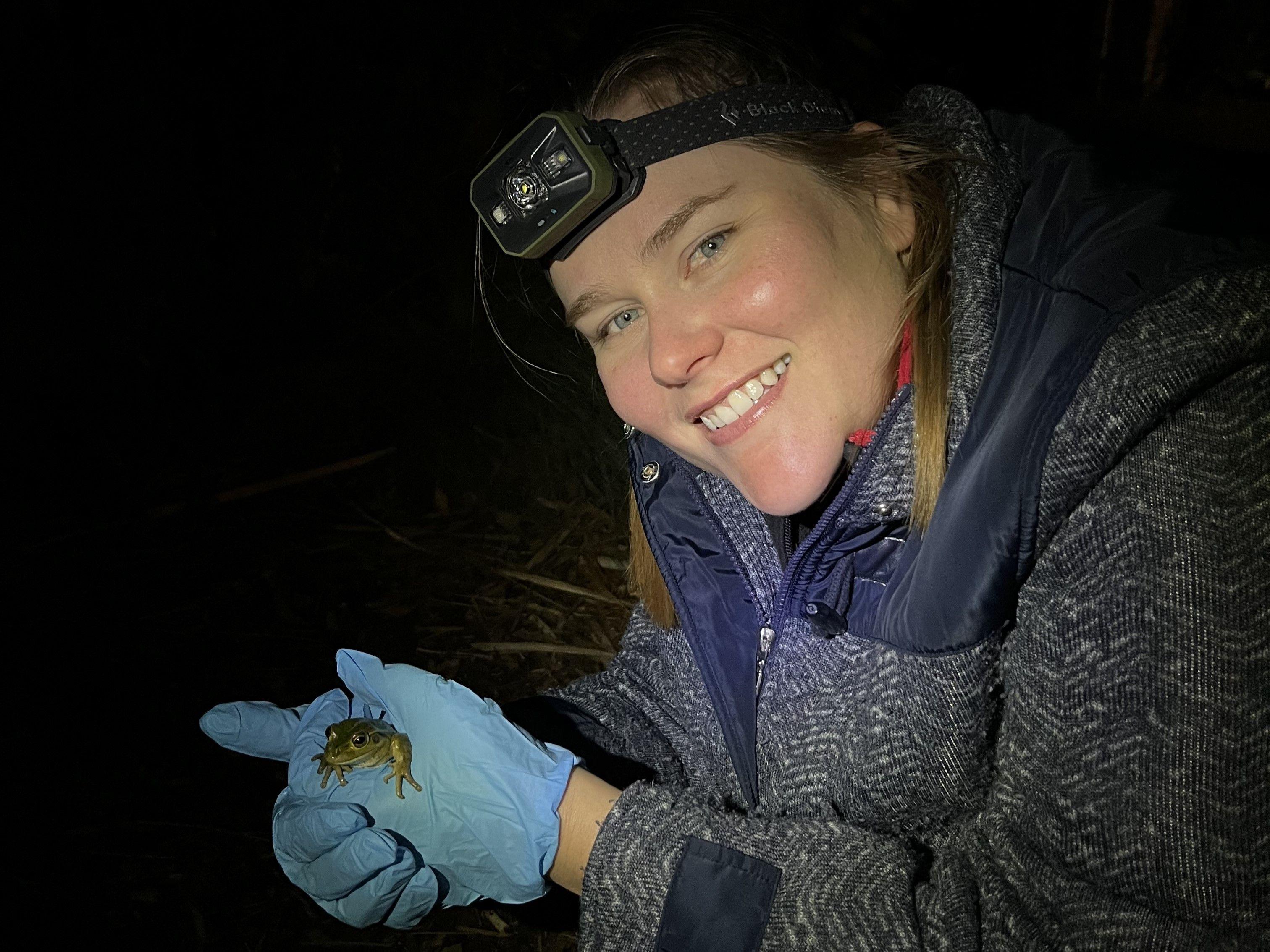 Lead researcher Bronte Van Helden holding a motorbike frog found in a backyard. Image: Holly Butterworth