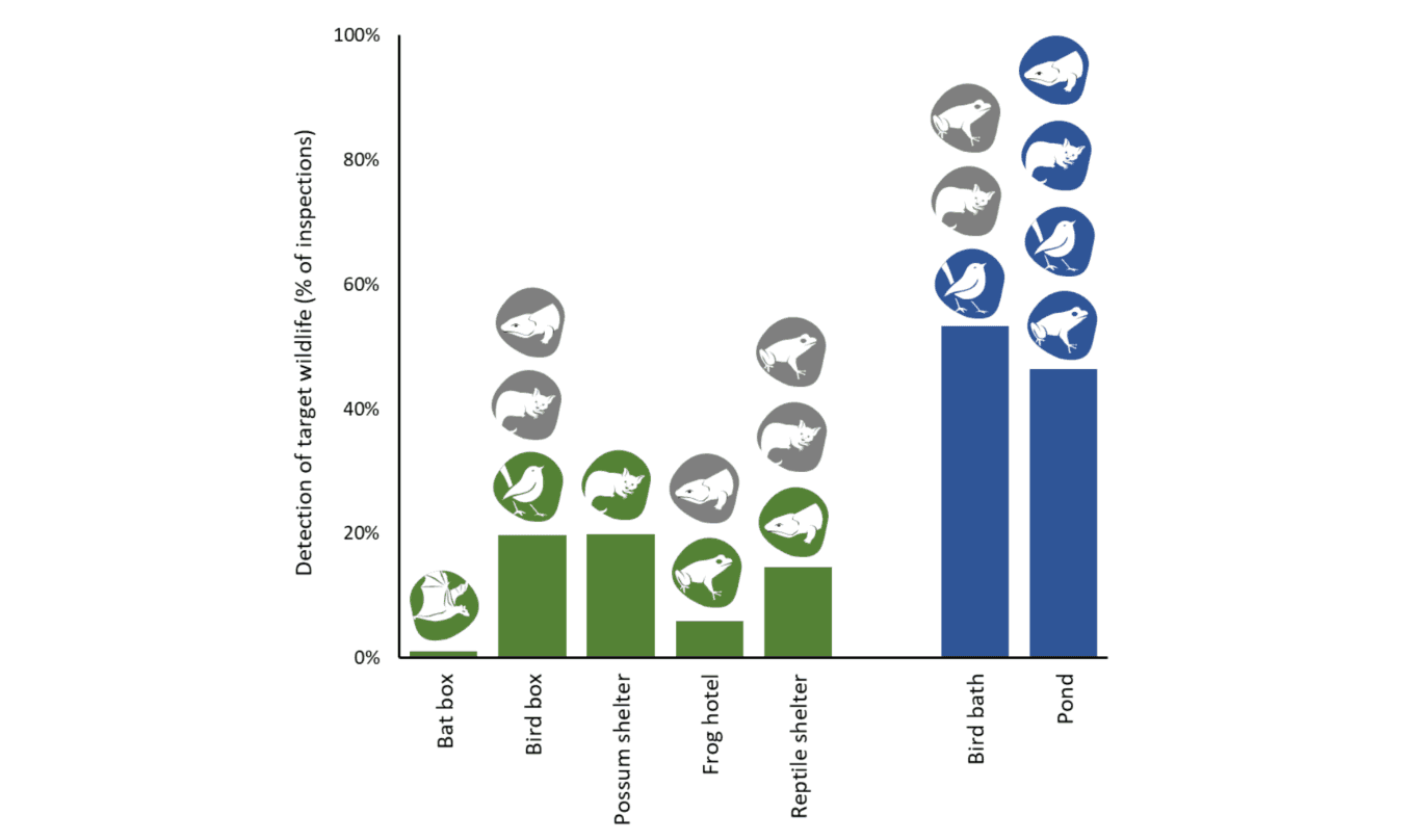 The project looked at the use of gardens by wildlife including if animals used seven wildlife-friendly structure types; two water sources - bird baths and ponds, and five artificial refuges - bat boxes, bird boxes, frog hotels, possum shelters and reptile shelters.