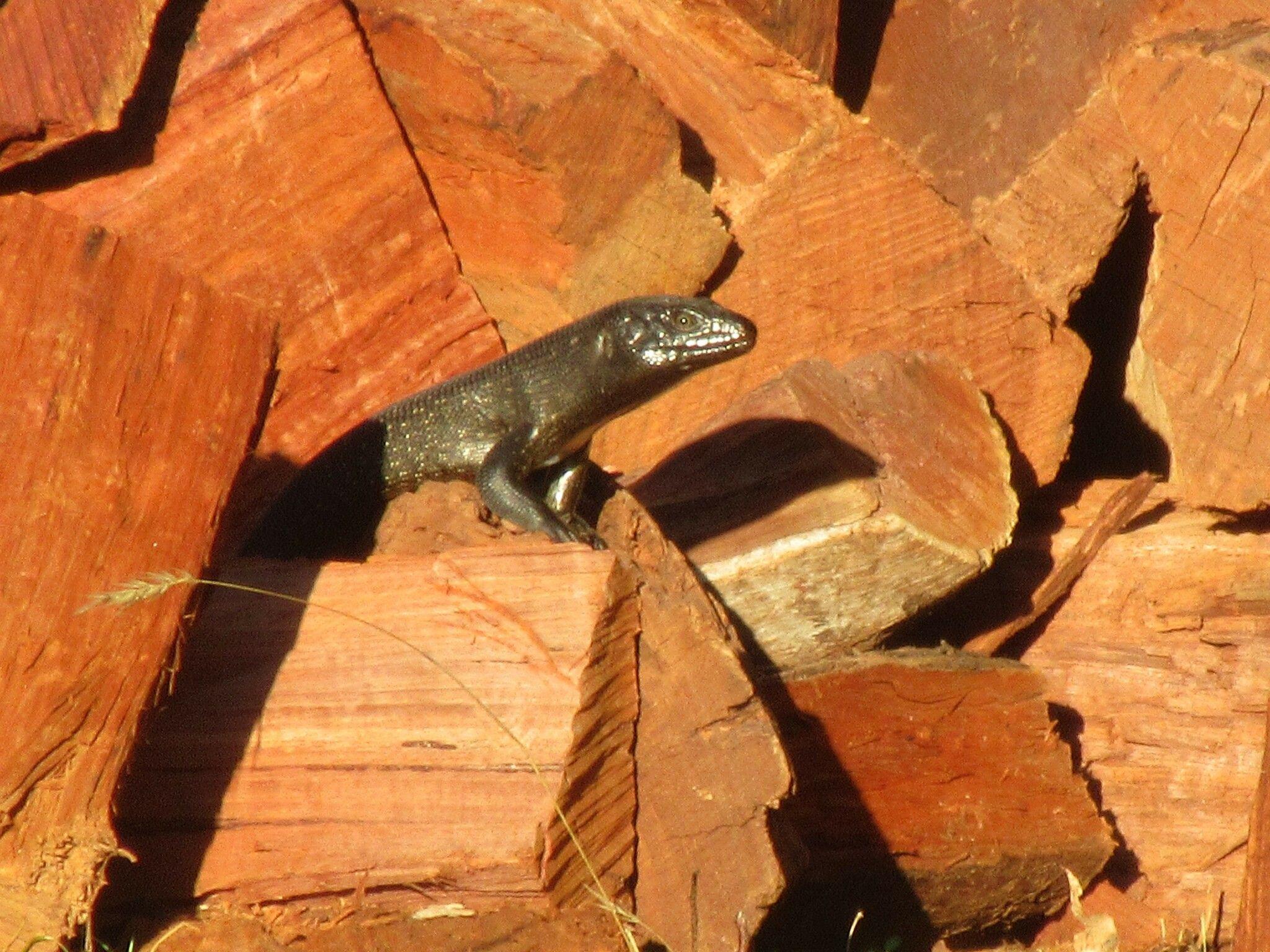 Lots of items you have around your backyard can be used to create habitat for reptiles. Image: King's skink sunbathing in a firewood stack Russell Palmer, CC-BY-NC via iNaturalist.