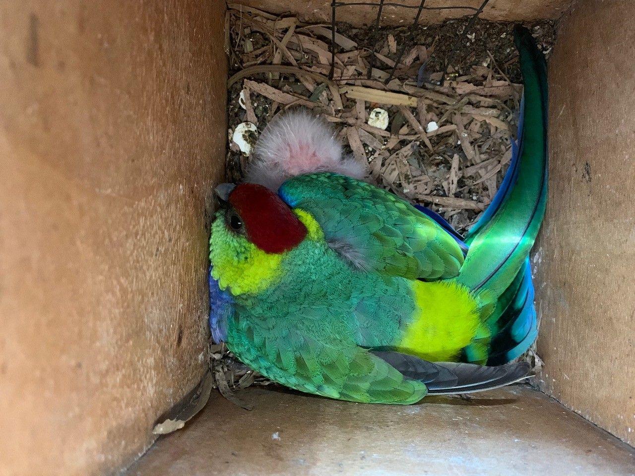 Red capped parrot chick hatchling inside an artificial bird box. Image: Sally Malone.