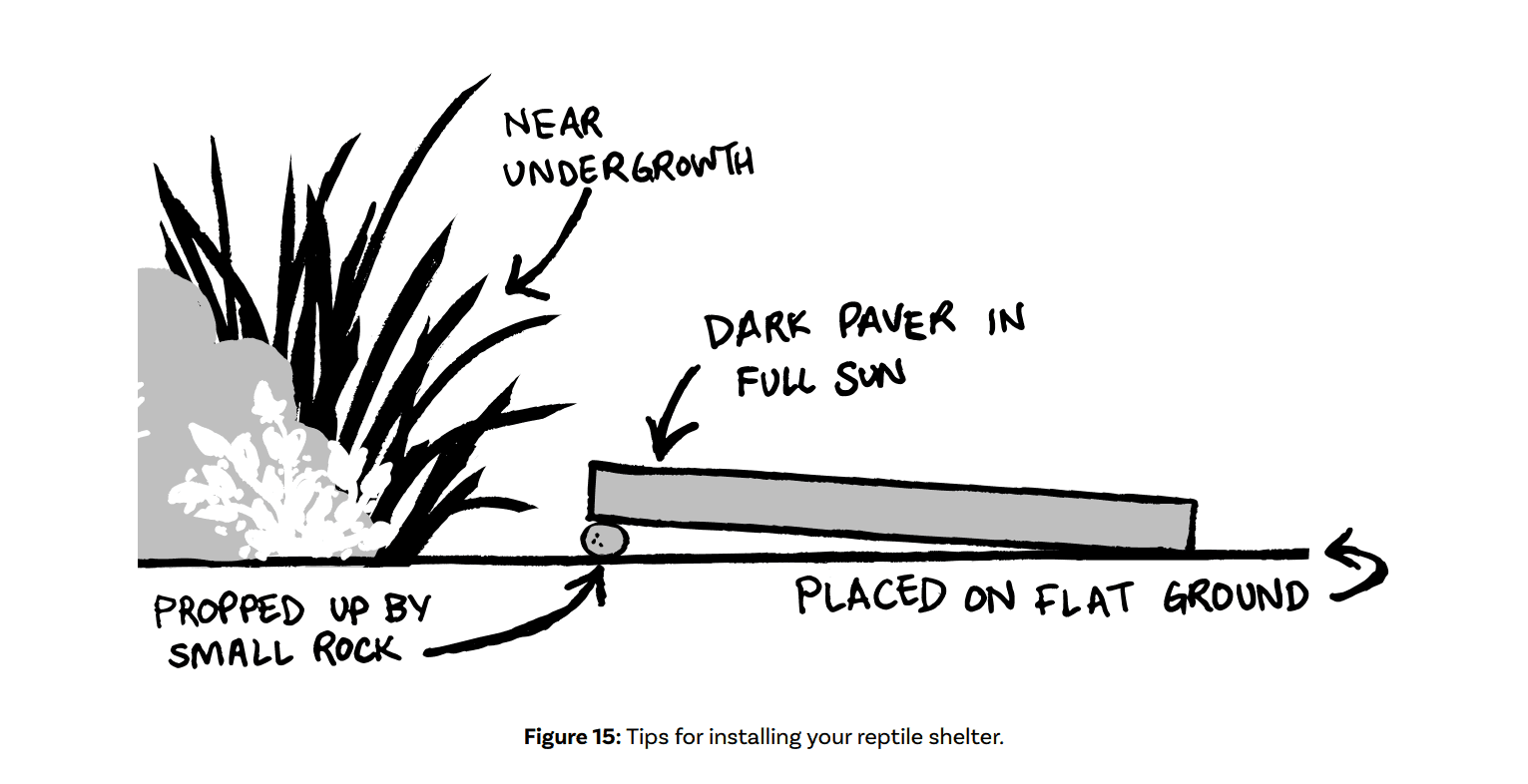 Taking a rock, paver or tile and slightly propping it off the ground is a cheap and effective way to increase shelter for reptiles in your backyard. Lizards enjoying basking in the sun and these structures provide reptiles with a warm spot that they can also use to hide.