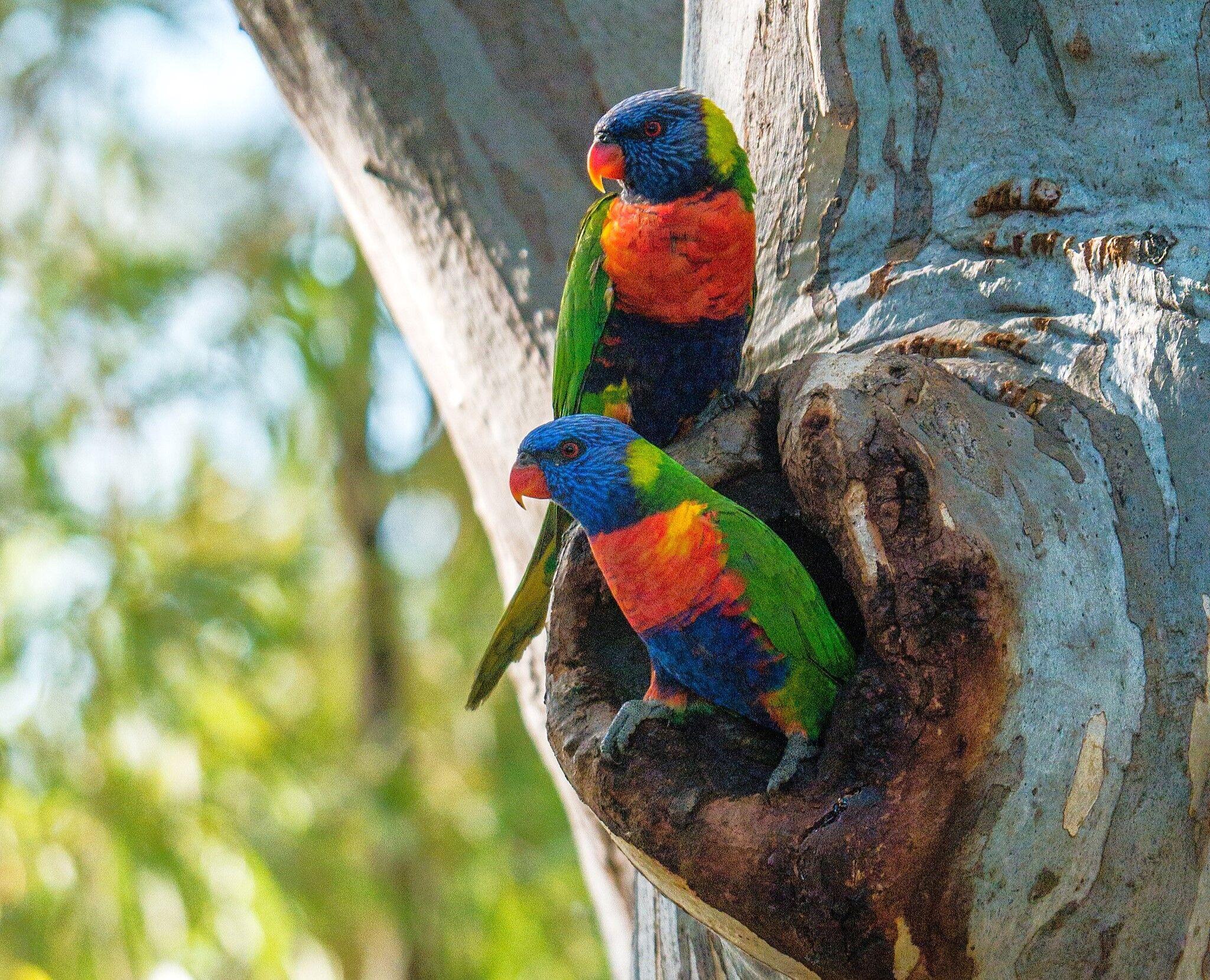 Rainbow lorikeets nesting in the hollow of a forest red gum. Image: John Robert McPherson, CC BY-SA 4.0 via Wikimedia Commons