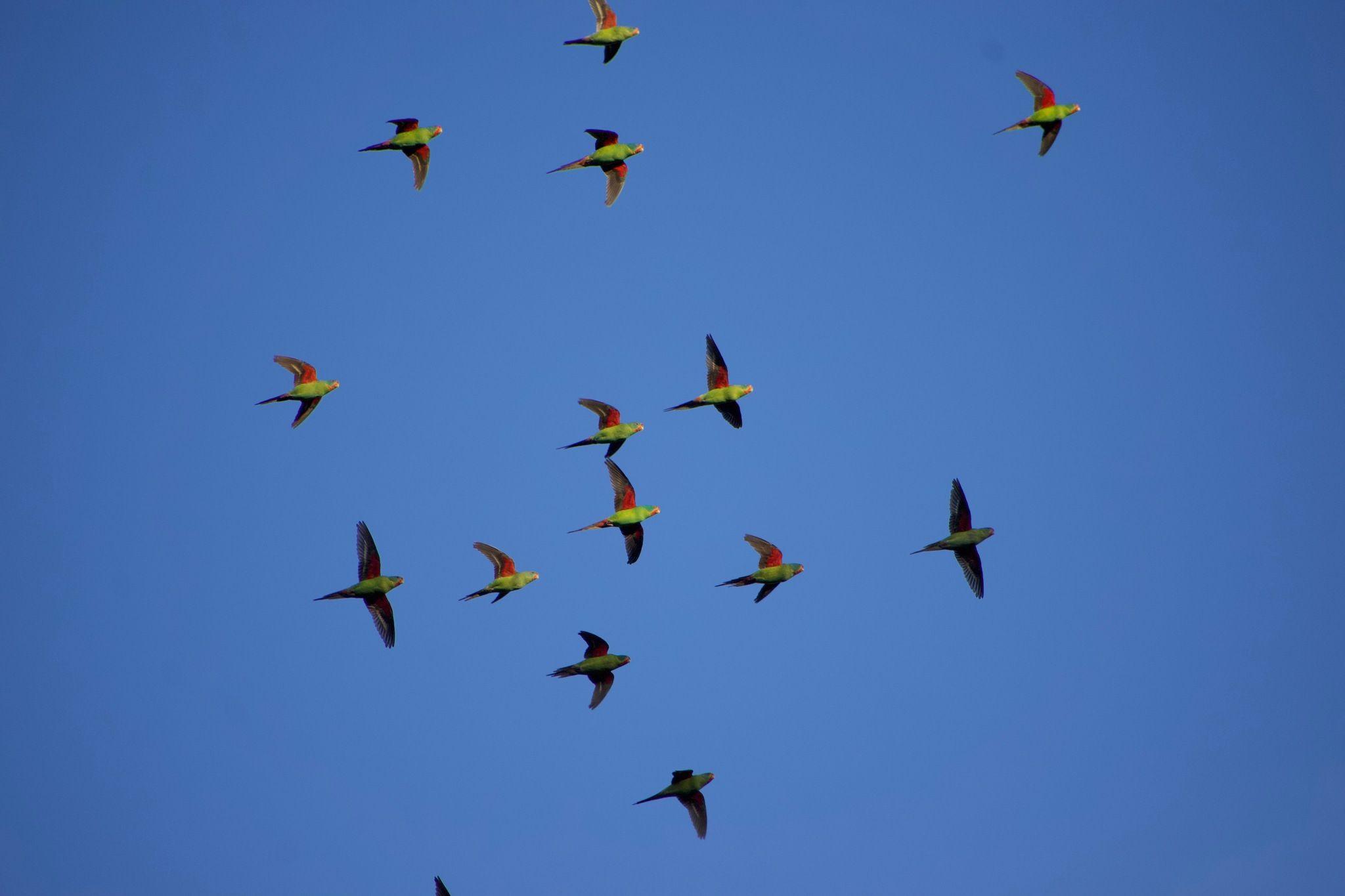 Swift parrots flying over Lysterfield, Victoria. Image: Irathbone, CC BY-NC 4.0 DEED via iNaturalist