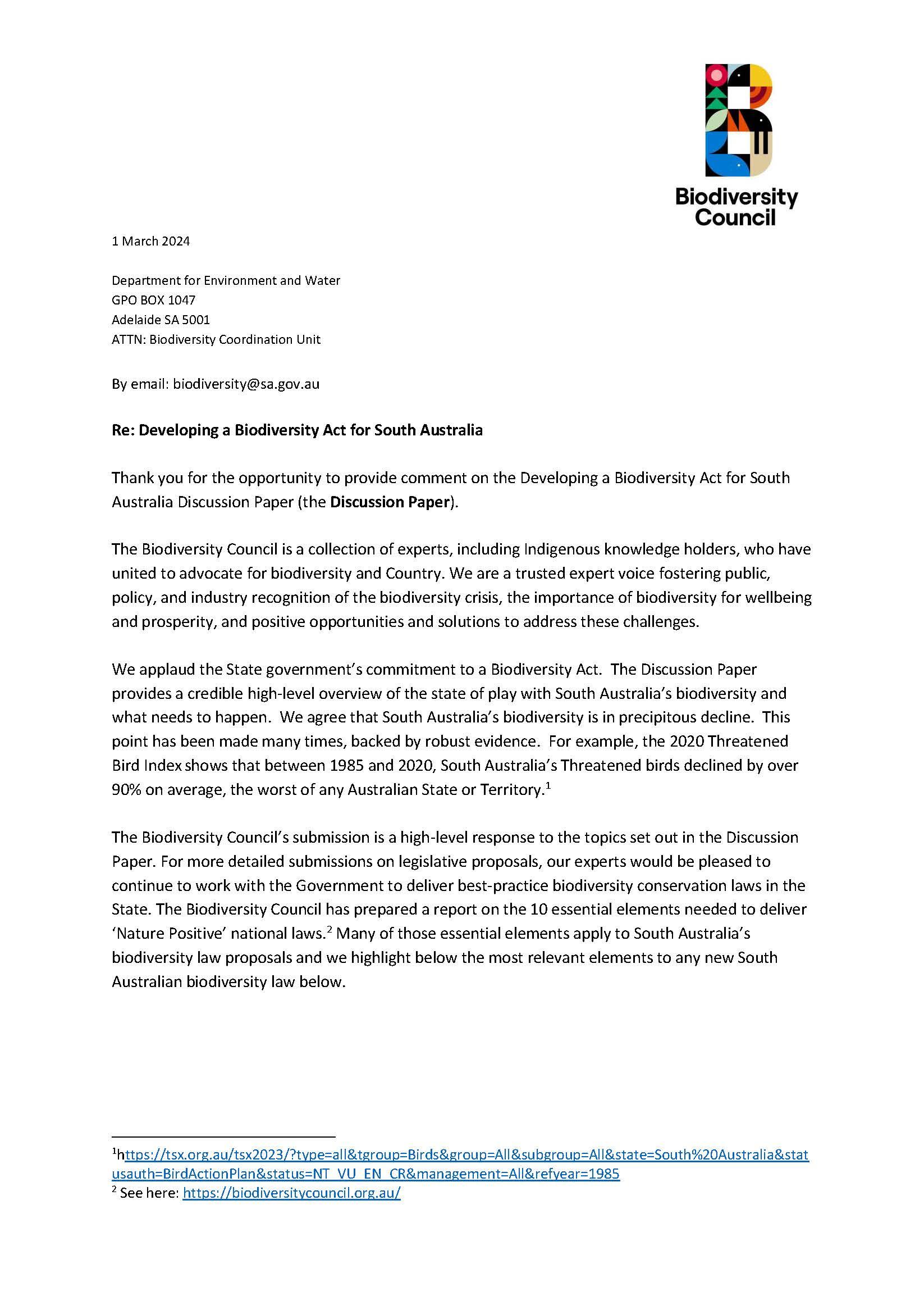 The Biodiversity Council’s submission is a high-level response to the topics set out in the Discussion Paper and makes recommendations in the areas of: