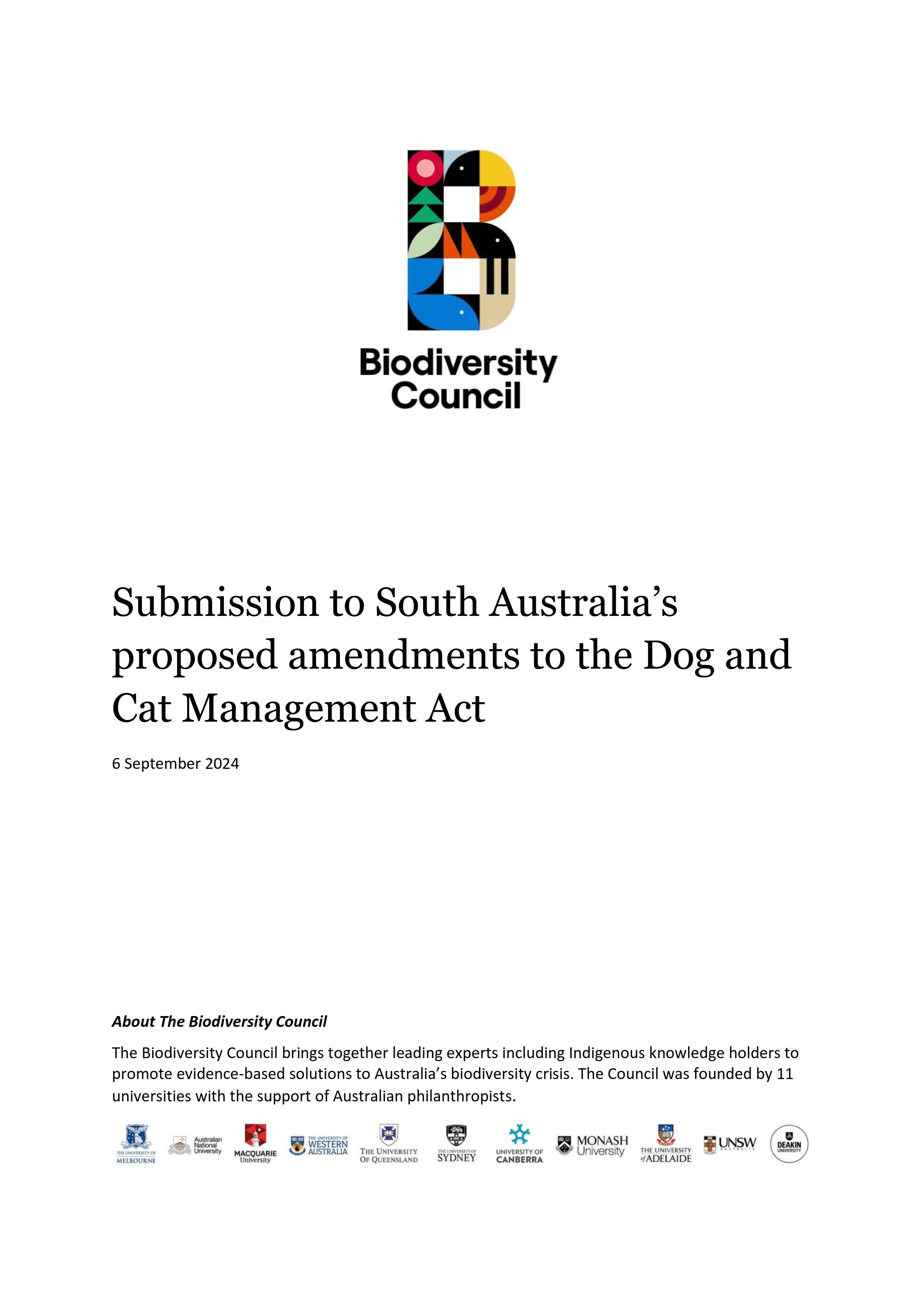 The Biodiversity Council welcomes the opportunity to provide feedback on the proposed amendments to the South Australian Dog and Cat Management Act 1995 to improve cat management. The Biodiversity Council supports the South Australian Government’s intentions to amend laws to remove barriers to control feral cats, particularly on rural lands.