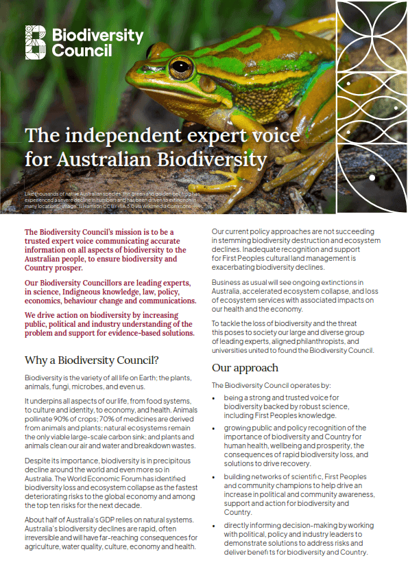 The Biodiversity Council’s mission is to be a trusted expert voice communicating accurate information on all aspects of biodiversity to the Australian people, to ensure biodiversity and Country prosper.